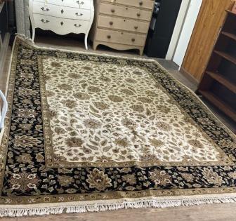 A large floral design ivory black floor rug.