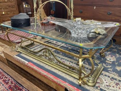A gilt wrought iron rectangular glass top coffee table.