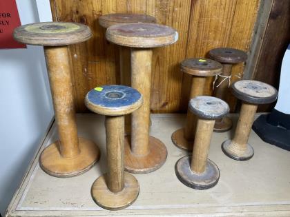 A collection of vintage timber spools.