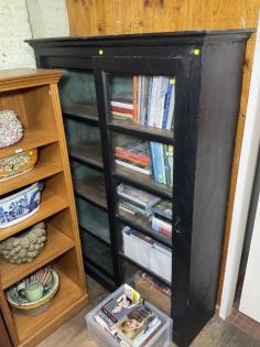 A black two door sliding upright bookcase.