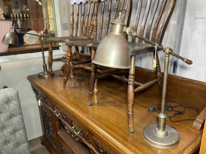 A pair of brass adjustable electrified reading lamps.