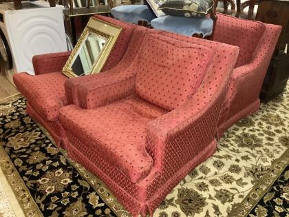 A three piece red upholstered loose cushion lounge suite.